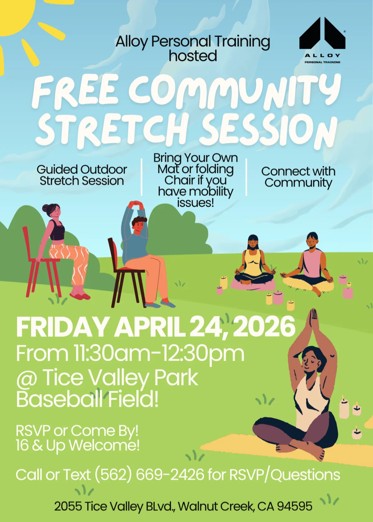 Join us for the Free Community Stretch Session: Mobility Stretching, Restore & Connect! Perfect for all fitness levels, this beginner-friendly event focuses on mobility, relieving tension, and enhancing flexibility. Connect with others outdoors and restore your body and mind. No experience needed, bring your mat and enjoy a rejuvenating session at Tice Valley Park. Whether you want to improve flexibility, reduce pain, or relax, this session is for you!